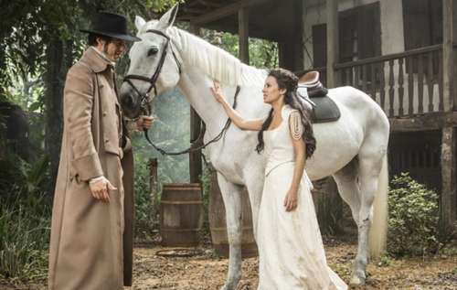 Ao sair para o quintal, se depara com Rubião (Mateus Solano), que chega sorridente com um puro-sangue branco.