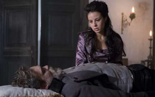 Joaquina (Andreia Horta) entra na Intendência com Rubião (Mateus Solano) e se depara com o corpo do pai em cima de uma mesa.