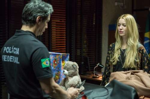 "Dona Júlia Monteiro, a senhora tá presa por tráfico internacional", decreta a policial. Ao ouvir a frase, a bailarina desmaia e cai no chão, batendo a cabeça na quina de uma mesa. (Com Gshow)