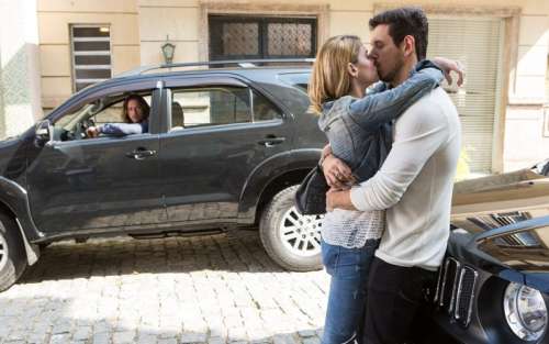 Para comemorar o momento, Lázaro beija Diana. No mesmo momento, Gui chega de carro. vê a cena e fica chocado. (Com Gshow)