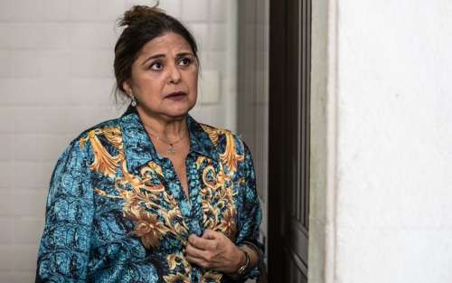 A morena abre a porta e leva um susto ao ver Aurora (Elizangela) com uma cara de apavorada.