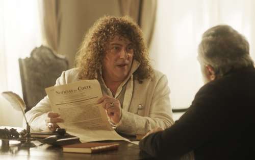 Ele pega um exemplar e lê: “Dom Pedro declara: Se o povo quiser, que venha a república!”. Quero ver ele e os liberais se safarem dessa! (Com Gshow)