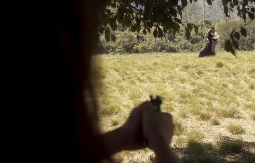 Eles se beijam, e a amante chora. Ela até engatilha uma arma, mas logo desiste da ideia.