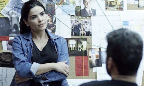 Na delegacia, Antônia (Vanessa Giácomo) coloca as fotos da ex-camareira, de Agnaldo (João Baldasserini) e de Júlio (Thiago Martins) juntas no quadro de referências e fica encarando as imagens ao lado de Domênico (Marcos Veras), desconfiada.