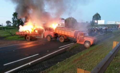 Os invasores atearam fogo em dois caminhões na BR 277 na altura do KM 706, a rodovia está totalmente interditada. Cerca de 200 manifestantes do MST protestam.