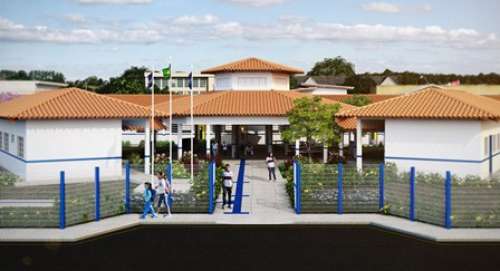 A Escola Nova Divinéia contará com 4 salas de aula, bloco administrativo, de serviços e hall central com uma área construída de 785,54m² e atenderá 144 alunos por turno.