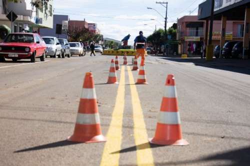 A secretaria de obras está renovando a pintura de sinalização horizontal em toda a extensão da Rua Francisco Dellê.